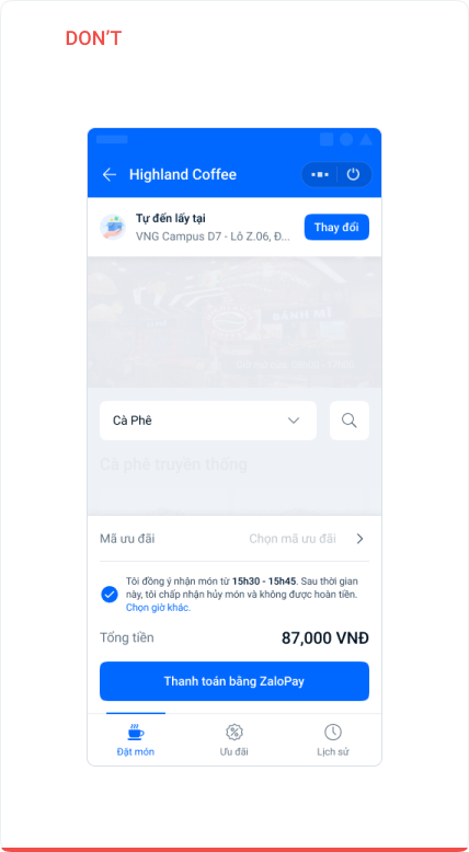 Ví dụ: Trong hình bên dưới, tại bước tìm kiếm cửa hàng Highlands Coffee, một API vị trí địa lý (Tìm gần nhất) được sử dụng để tạo điều kiện cho người dùng nhập liệu. Bên cạnh đó, nhóm Zalo cung cấp nhiều API chương trình nhỏ khác nhau (chẳng hạn như nhận dạng máy ảnh), qua đó bạn có thể cải thiện đáng kể hiệu quả và độ chính xác nhập liệu của người dùng, đồng thời nâng cao hơn nữa trải nghiệm người dùng.