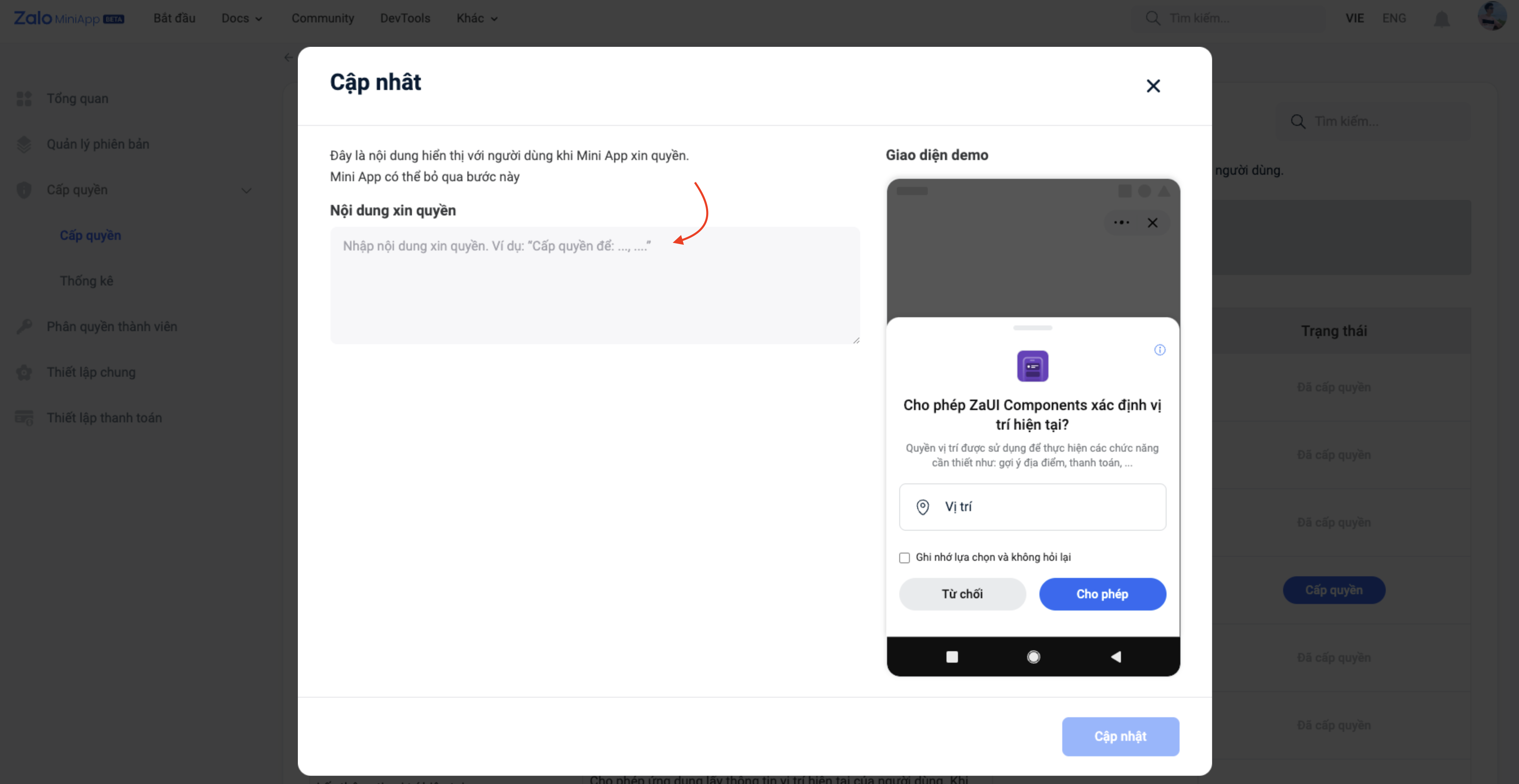 Trong quá trình phát triển Mini App sẽ có những tính năng cần phải truy cập vào các thông tin của người dùng. Các quyền này cần sự đồng ý và cho phép của người dùng.