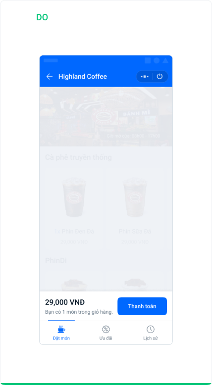 Trong trường hợp bạn có thiết kế màu sáng hoặc tối hãy lựa chọn phương án màu cho Zalo Mini App menu phù hợp. Chú ý hãy đảm bảo mọi thứ được hiển thị rõ ràng và đủ độ tương phản cần thiết.