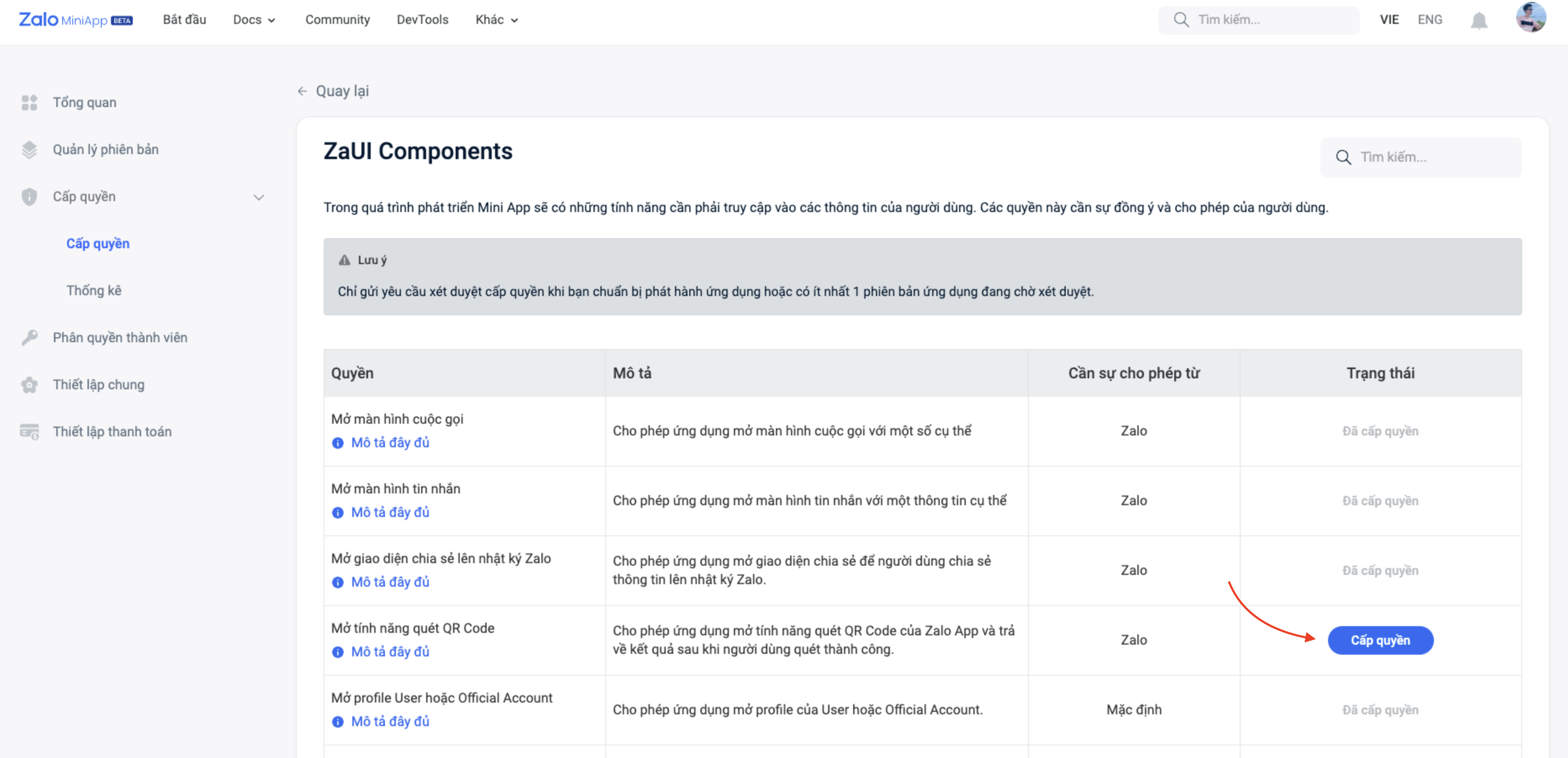 Đối với các quyền cần sự cho phép từ Zalo Mini App, nhà phát triển cần tạo yêu cầu cấp quyền & có sự cho phép từ Zalo Mini App.