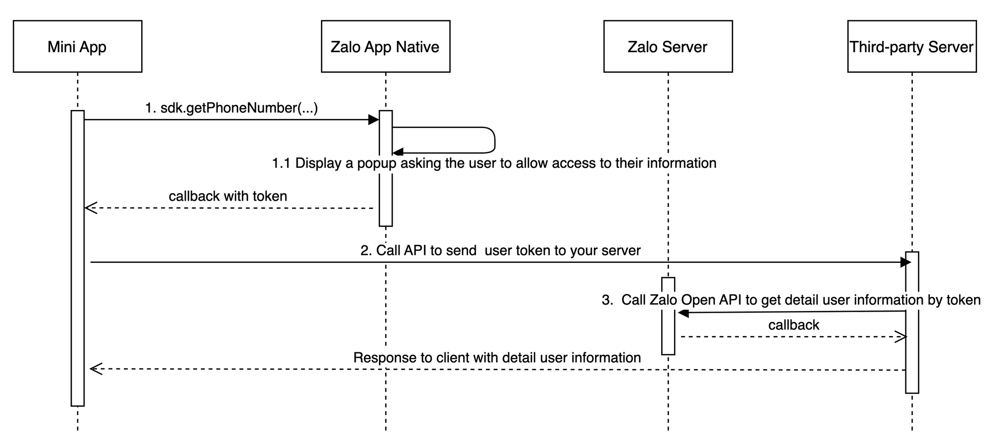 Lấy thông tin số điện thoại của người dùng. Khi gọi api, một thông báo xin cấp quyền sẽ được hiển thị. Mini App chỉ lấy được thông tin số điện thoại nếu người dùng đồng ý cấp quyền chia sẻ số điện thoại.